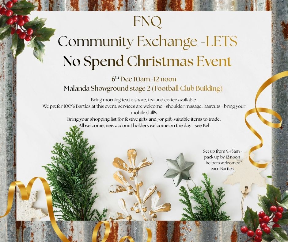 We prefer 100% Bartles at our No-$pend Xmas events. Services are welcome – shoulder massage, haircuts – bring your mobile skills!